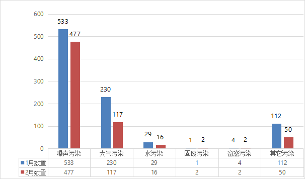 2月份,全省生态环境部门共受理655件生态环境问题信访投诉,同比增长24.52%,环比下降27.78%,其中已办结630件,办结率约为96.18%。从污染类型分类情况来看,噪声污染问题477件,占总数的71.84%(其中工业噪声44件、建设施工噪声7件、社会生活娱乐噪声426件,分别9.22%、1.47%、89.31%);大气污染问题117件, 占总数的17.62%;水污染问题16件,占总数的2.41%;固废污染问题2件,占总数的0.3%;畜禽粪便污染问题2件,占总数的0.3%;其它污染问题50件,占总数的7.53%。