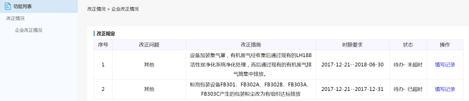 | 15 | 有整改要求的企业,完成改正任务的,如何提交改正完成情况 | 企业应在改正完成时限之前,填写改正措施落实情况,并提交环保部门审核。