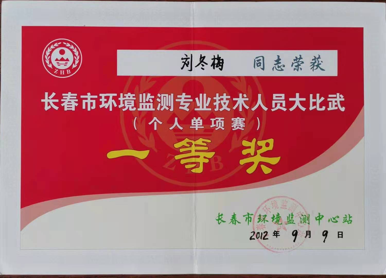 2012年刘冬梅同志代表我单位参加了“长春市环境监测专业技术人员大比武”,获得个人单项赛(高锰酸盐指数组)一等奖。在比赛前一个多月的时间里,她早上5点起床学习笔试的内容,7点多钟就到单位练习现场操作,晚上7点左右才离开单位。对于这么勤奋刻苦的同志,我单位也给予大力支持,光是标准样品就提供10余支供其练习。最终她没有辜负自己的付出和大家的期望,也实现了她的人生信条——时间和精力用在哪里,成果就出在哪里。通过这次比赛,她的专业技能也更加精进了。