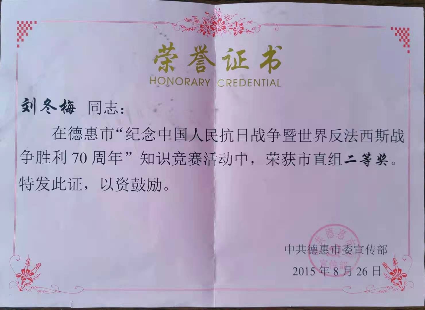 刘冬梅同志虽不是党员,却积极拥护党的领导、响应党的号召,时刻为自己是一个中国人感到骄傲。2015年,中共德惠市委宣传部组织了“纪念中国人民抗日战争暨世界反法西斯战争胜利70周年”知识竞赛活动,接到参赛通知后,她开始收集材料,起早贪黑地备战。在此期间,她母亲因胃出血在长春住院她都没能去医院陪护。苦心人、天不负。她通过初赛、复赛的层层筛选进入决赛,并荣获市直组二等奖,进一步提高了思想政治觉悟、提升了爱国主义情怀。