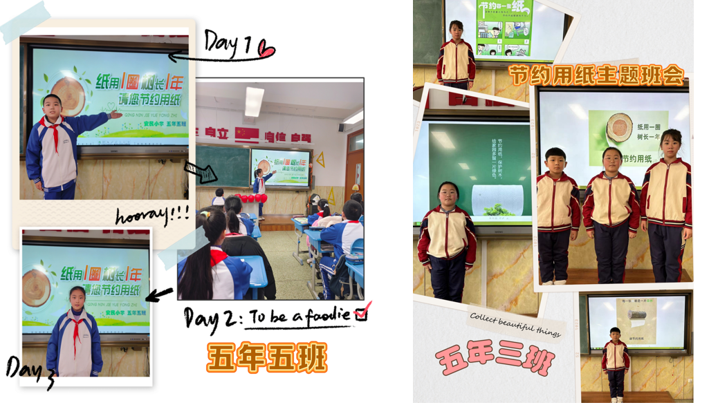 “五节约”指学校提倡全体师生节约用纸、节约用品、节约用水、节约用电、节约用餐。各班围绕“五节约”、开展了主题班会,同时绘制了“节约有我,杜绝浪费”的手抄报。
