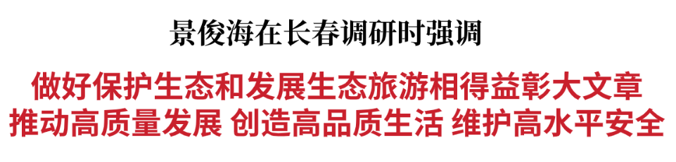 调研中,景俊海强调,做好保护生态和发展生态旅游相得益彰这篇大文章,是深入贯彻习近平总书记视察吉林重要讲话重要指示精神、建设生态强省、满足人民群众对美好生活向往的重要举措。要持续深入推进污染防治攻坚战,高标准严要求做好各项工作,切实让人民群众呼吸清新空气、喝上干净的水、吃上放心粮食。要持续深入推进山水林田湖草沙一体化保护和修复,加强江河湖泊生态环境系统治理、综合治理、协同治理;对破坏生态环境的行为要严厉惩处、绝不手软,坚决守住生态安全底线。要持续深入推进生物多样性保护,更好实现人与自然和谐共生。要持续深入推进生态旅游发展,充分兑现吉林优质生态资源价值。
