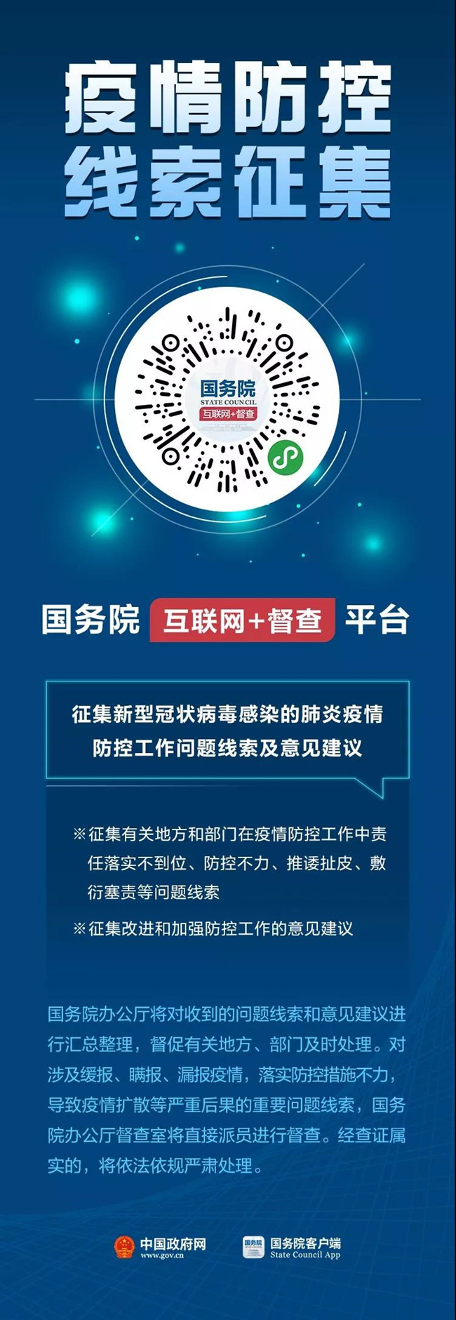 为贯彻落实党中央、国务院重要决策部署,切实做好新型冠状病毒感染的肺炎疫情防控工作,按照有关工作要求,国务院办公厅从即日起在国务院“互联网+督查”平台面向社会征集有关地方和部门在疫情防控工作中责任落实不到位、防控不力、推诿扯皮、敷衍塞责等问题线索,以及改进和加强防控工作的意见建议。