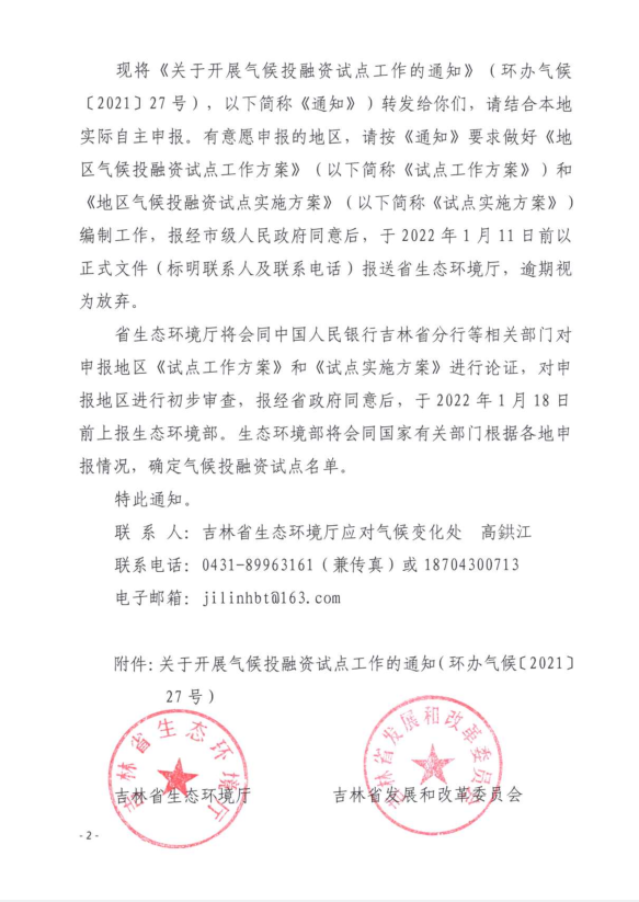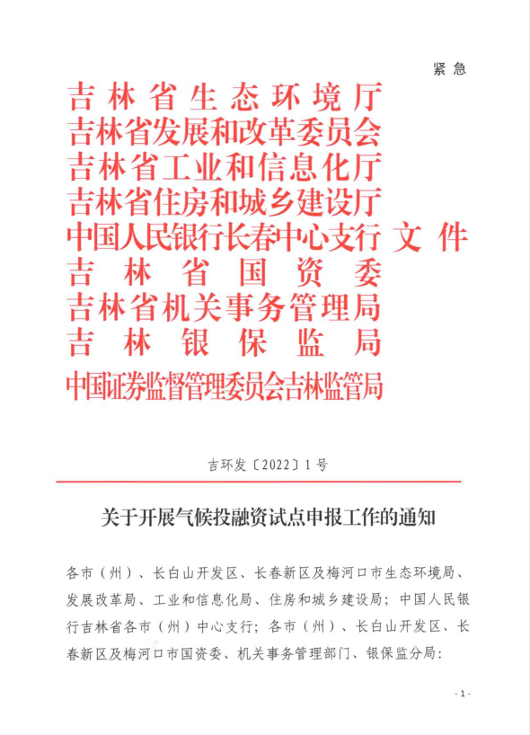 标 题:关于开展气候投融资试点申报工作的通知(吉环发〔2022〕1号)